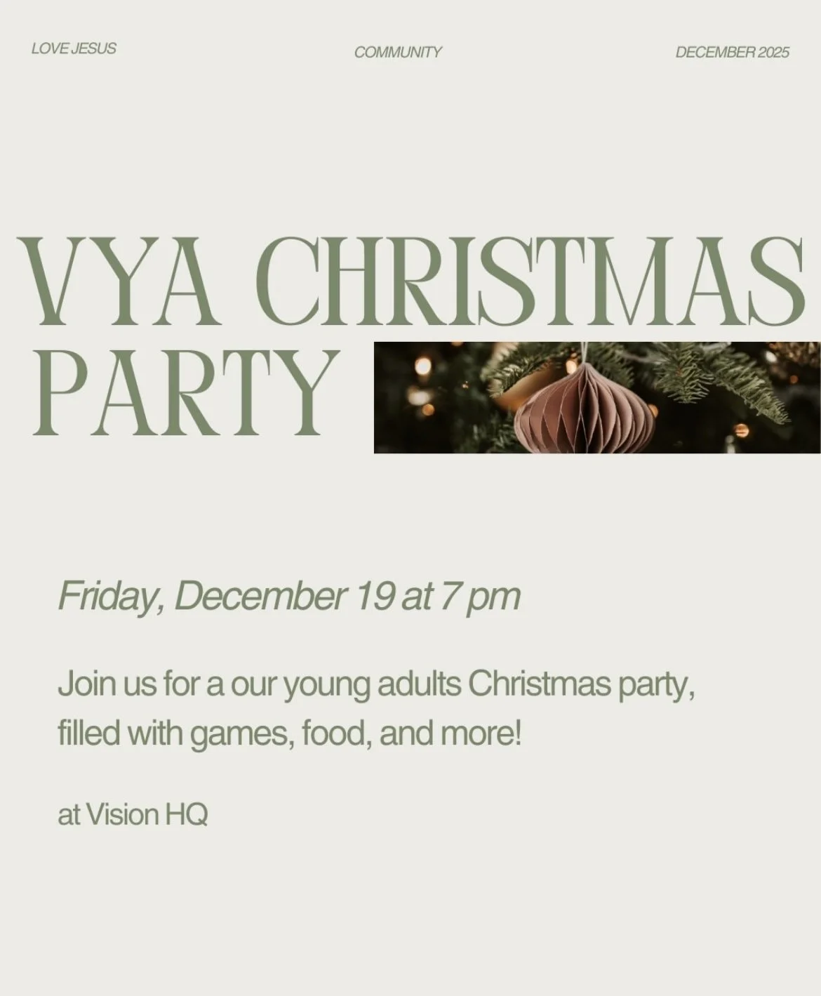 VISION YOUNG ADULTS CHRISTMAS PARTY Friday, December 19, 2025 7:00 PM 9:00 PM Vision Church HQ 1301 Monument Road, Suite 17 Jacksonville, FL, 32211 United States (map) Google Calendar ICS